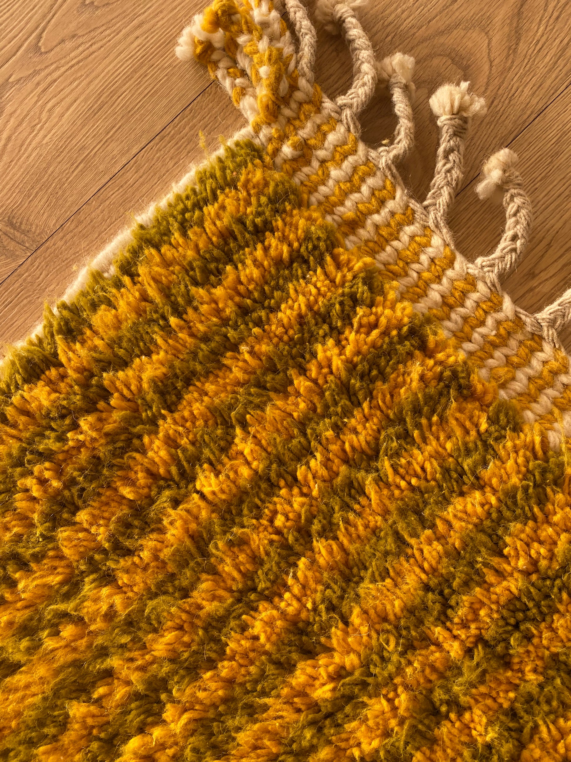 This rug is handwoven from natural sheep wool by Berber artisans in Khemisset, Morocco. Each rug is a unique piece, carefully crafted with traditional techniques and made to last.