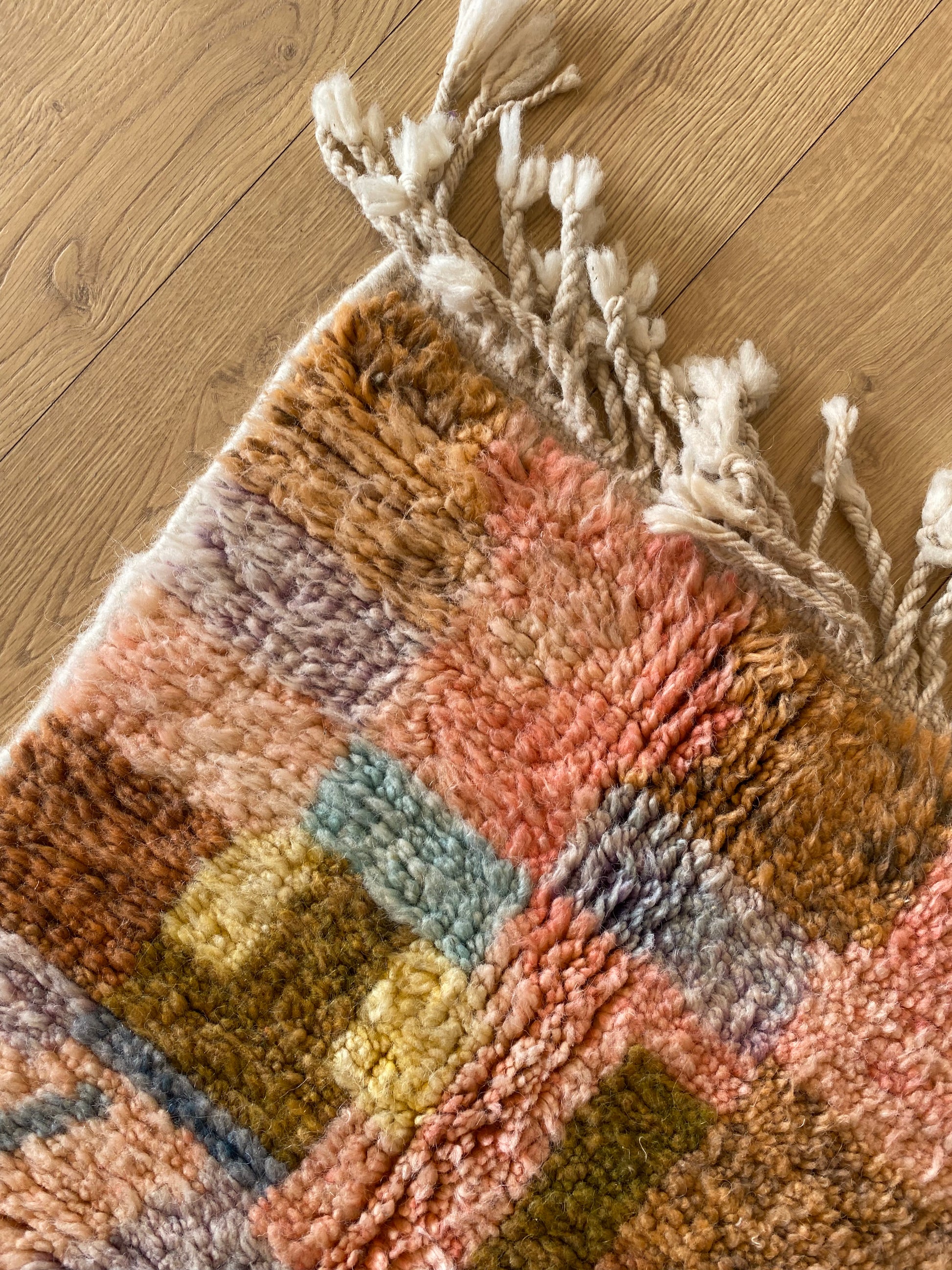 This rug is handwoven from natural sheep wool by Berber artisans in Khemisset, Morocco. Each rug is a unique piece, carefully crafted with traditional techniques and made to last.