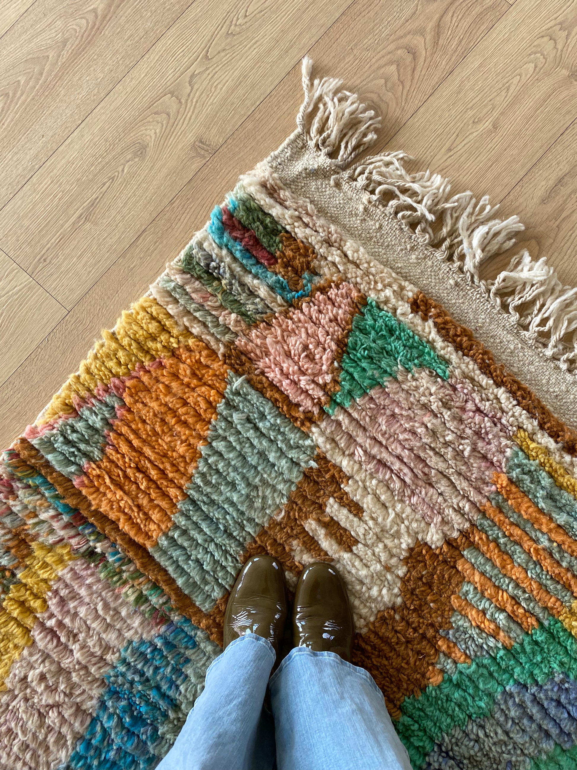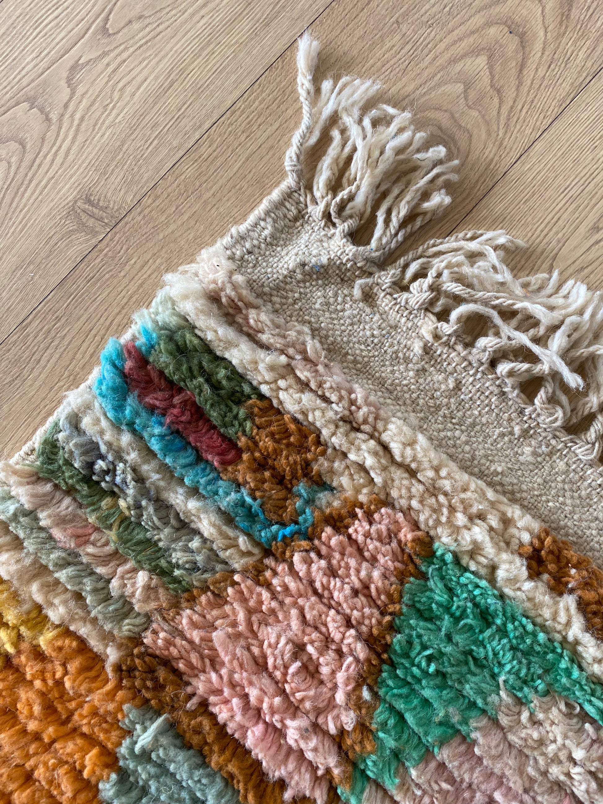This rug is handwoven from natural sheep wool by Berber artisans in Boujad, Morocco. Each rug is a unique piece, carefully crafted with traditional techniques and made to last.