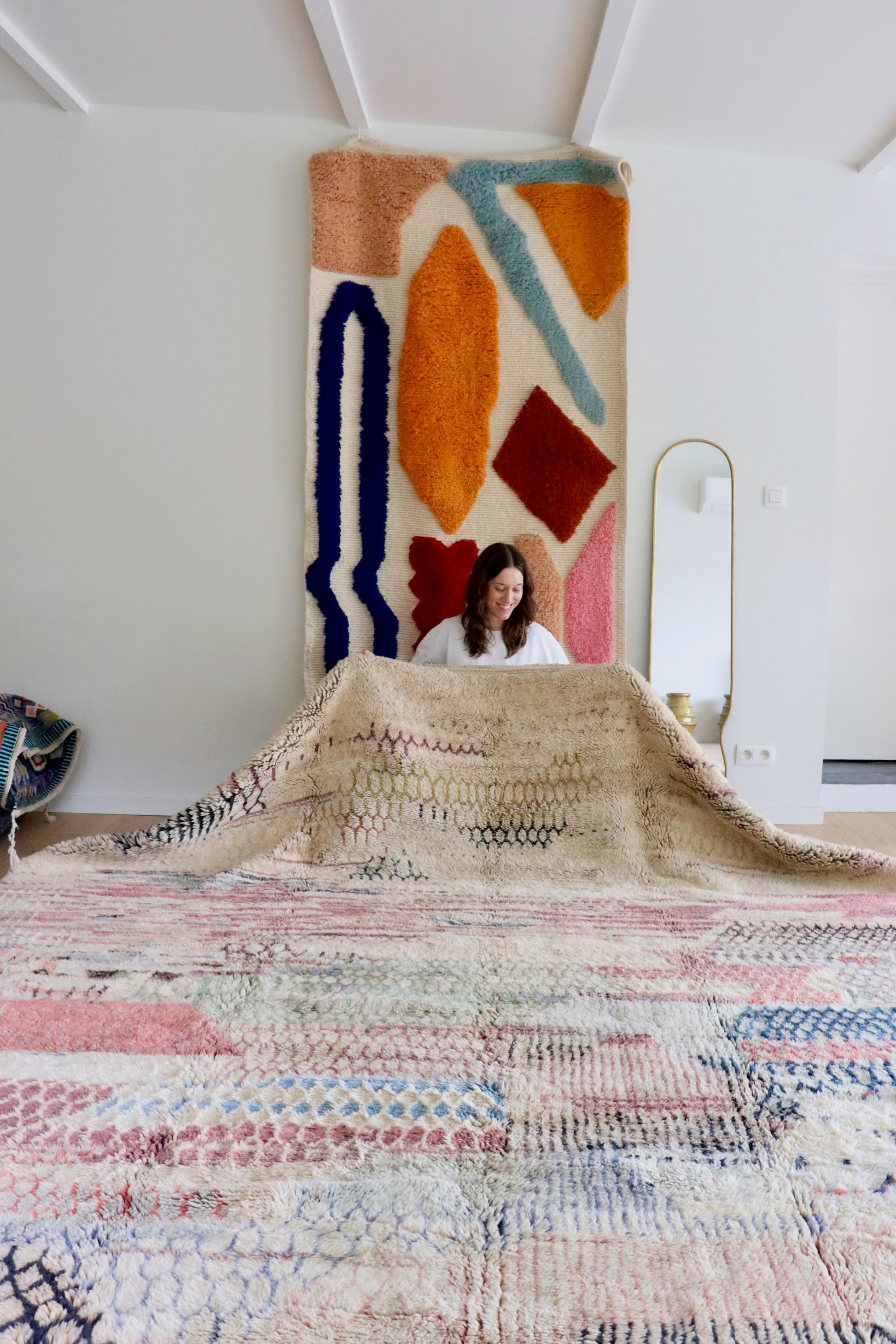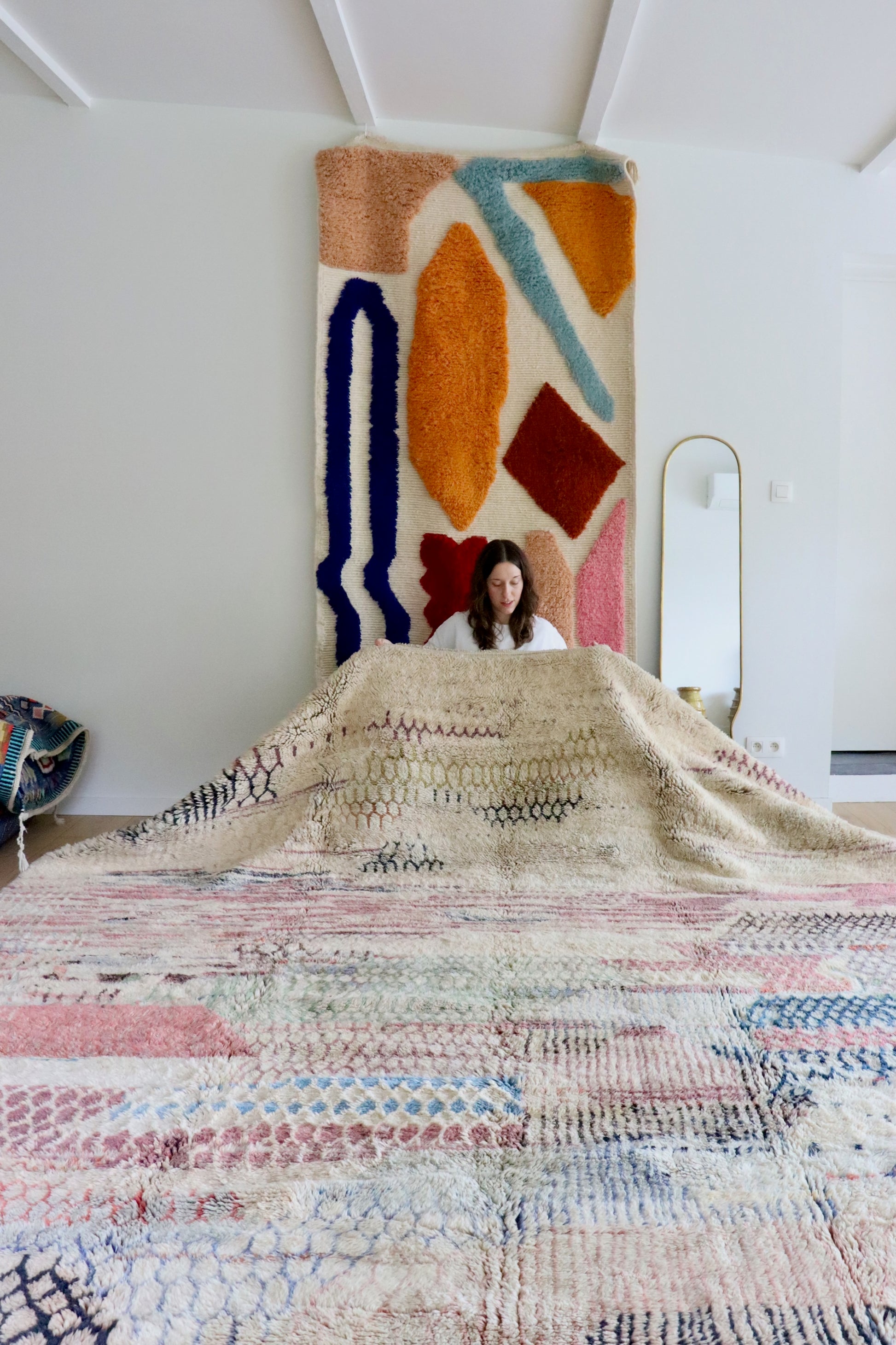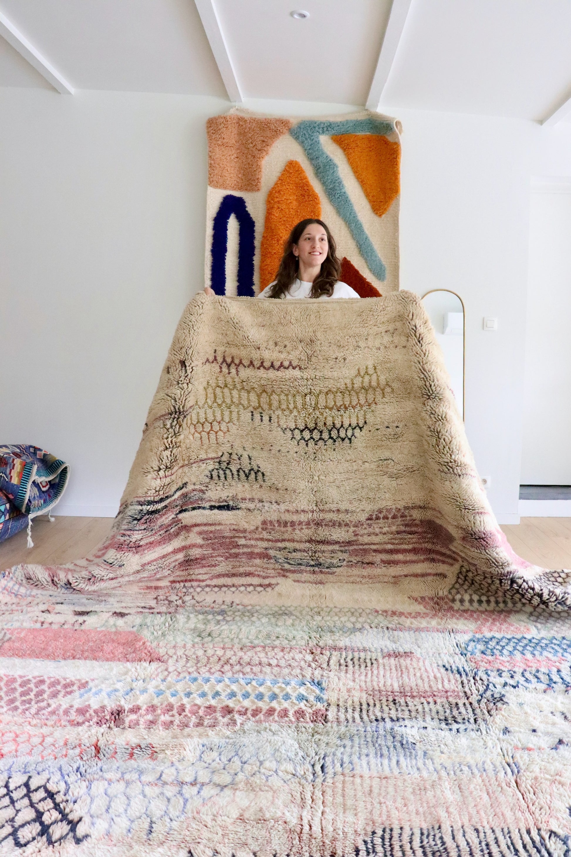 Handmade by Berber weavers in Khenifra, Morocco, this Mrirt rug is an exceptional piece, made with sheep wool. With its asymmetric patterns, very soft texture and medium-pile countless knots, this rug will bring a chic and authentic look to your interior.