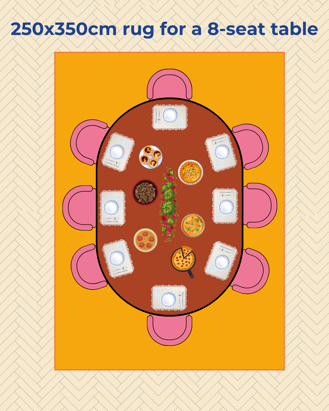 A 250x350cm rug is also suitable in a dining room with a large table seating eight. This size is not only aesthetically pleasing but also essential for ensuring smooth, comfortable, and enjoyable use. If your dining room is big enough, this size is perfect to get all chairs sitting on the rug and not outside the rug, which makes moving around more comfortable and easier.