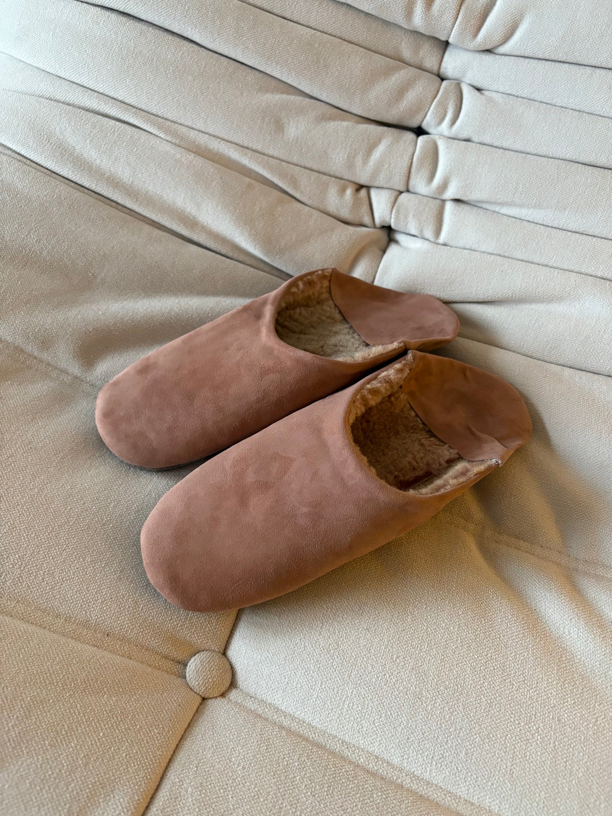 Those babouches are handmade in Marrakech. These are made of suede with sheepskin fur inside.