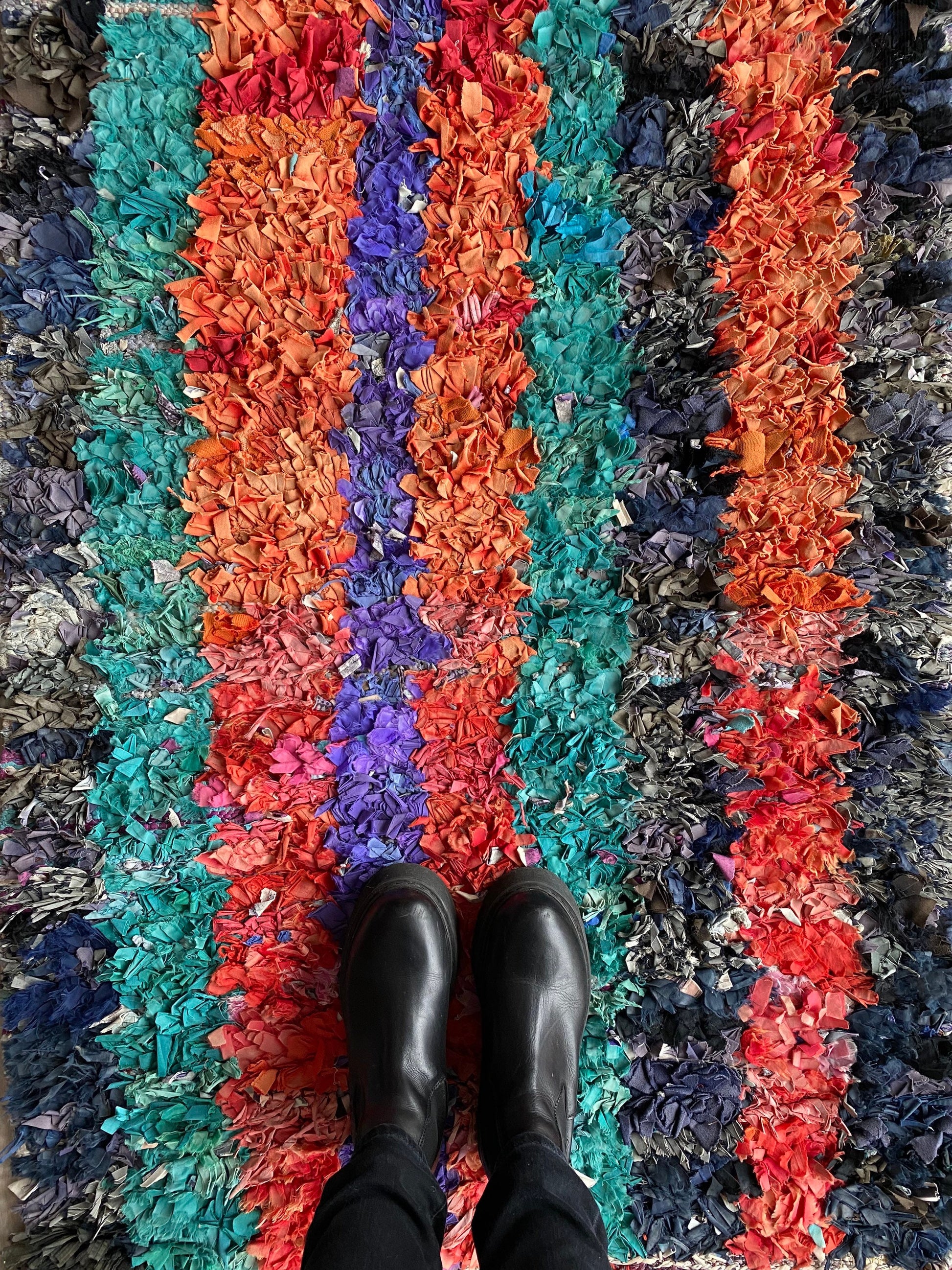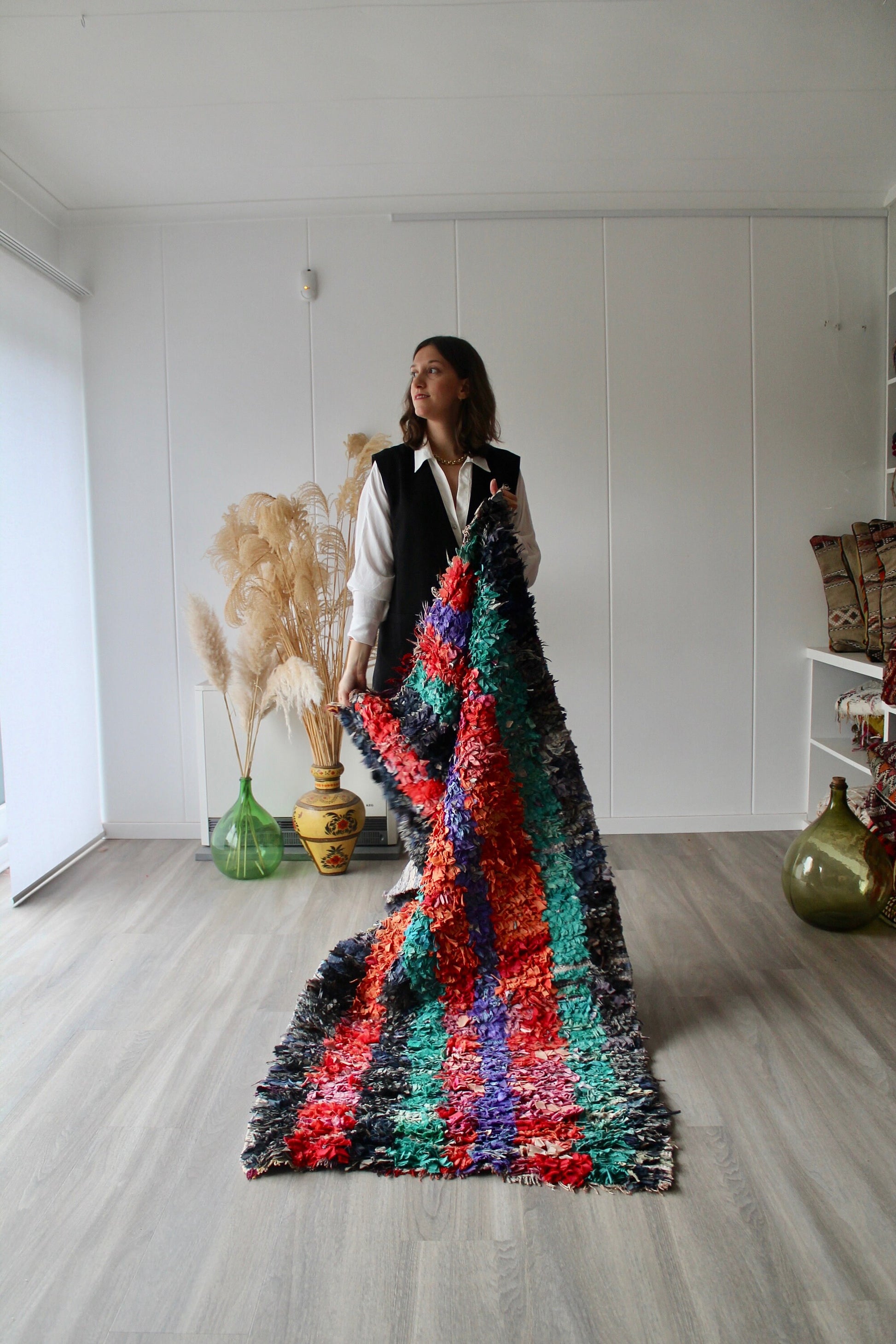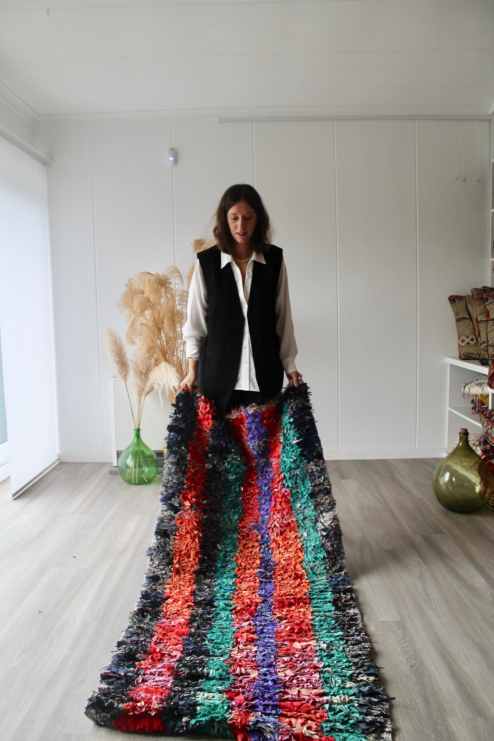 Handmade by Berber weavers in the High Atlas Mountains, this authentic Boucherouite Kilim rug is a truly unique piece, made from recycled cotton fabric. With its bright colorful patterns, it will liven up any room while bringing an effortless boho vibe. It's perfect for an entry way or cosy corner in your living room or bedroom.