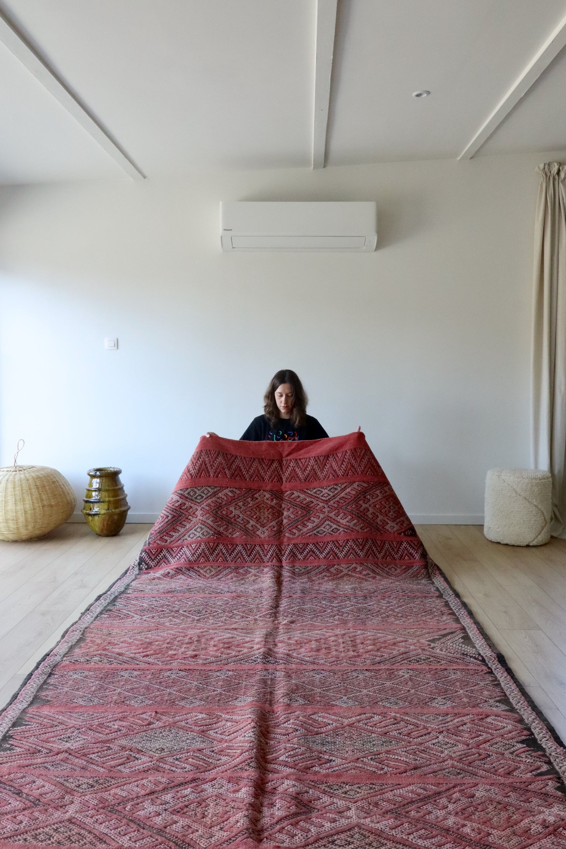 Handmade by Berber weavers in the Middle Atlas Mountains near Marrakech, this vintage kilim moroccan rug is handmade from 100% wool. With its warm patterns, this kilim will grant character to your home while becoming the masterpiece. Perfect for a living room or dining room.