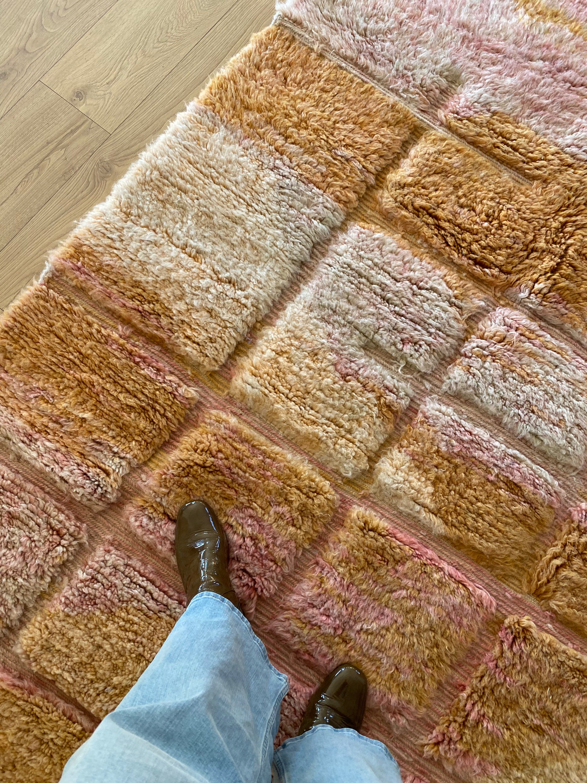 Ce tapis est tissé à la main en laine de mouton naturelle par des artisans berbères de la région du Moyen Atlas, au Maroc. Les tapis Beni Ouarain sont réputés pour leur laine douce et leurs motifs graphiques intemporels. Chaque tapis est une pièce unique, confectionnée avec soin pour durer.