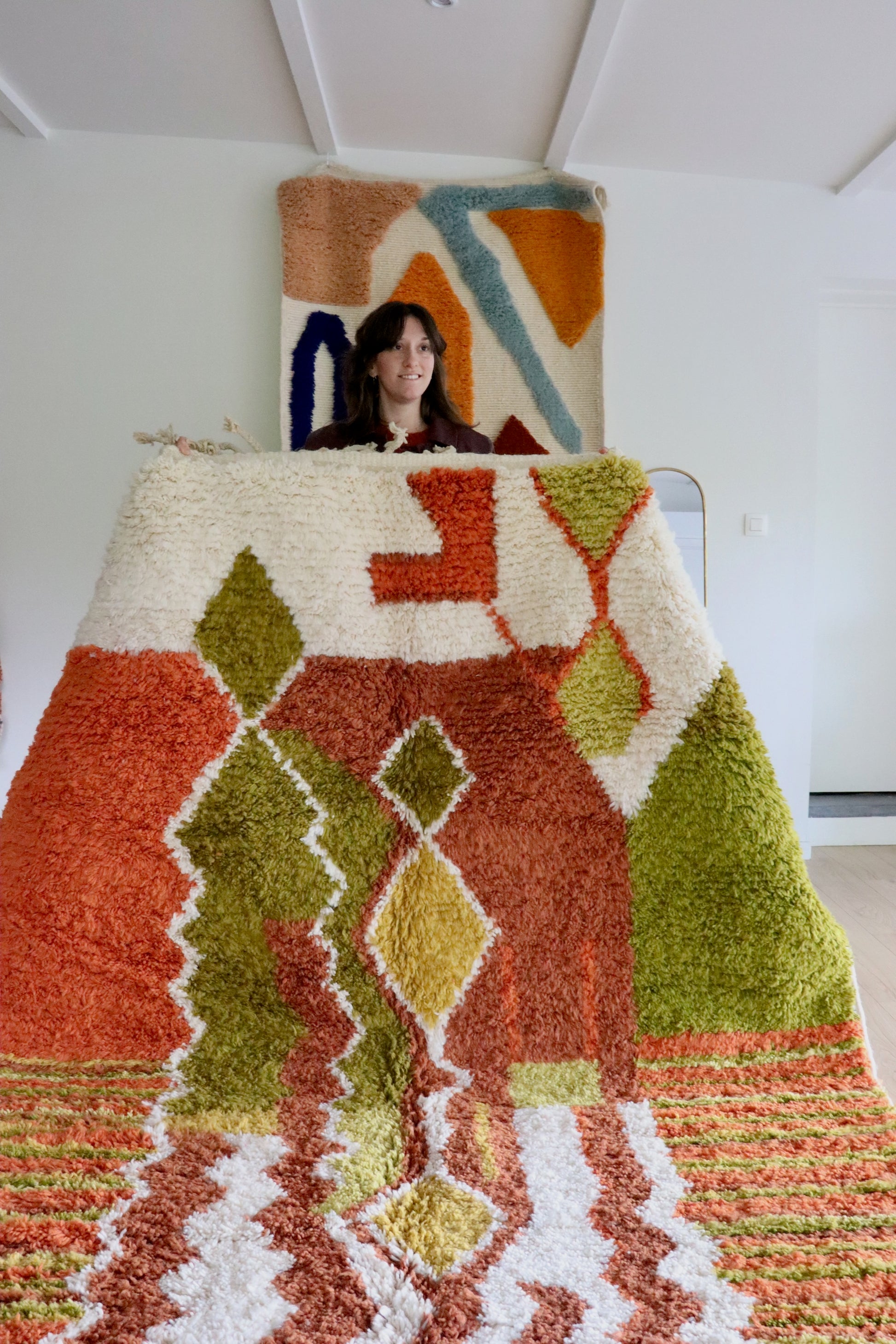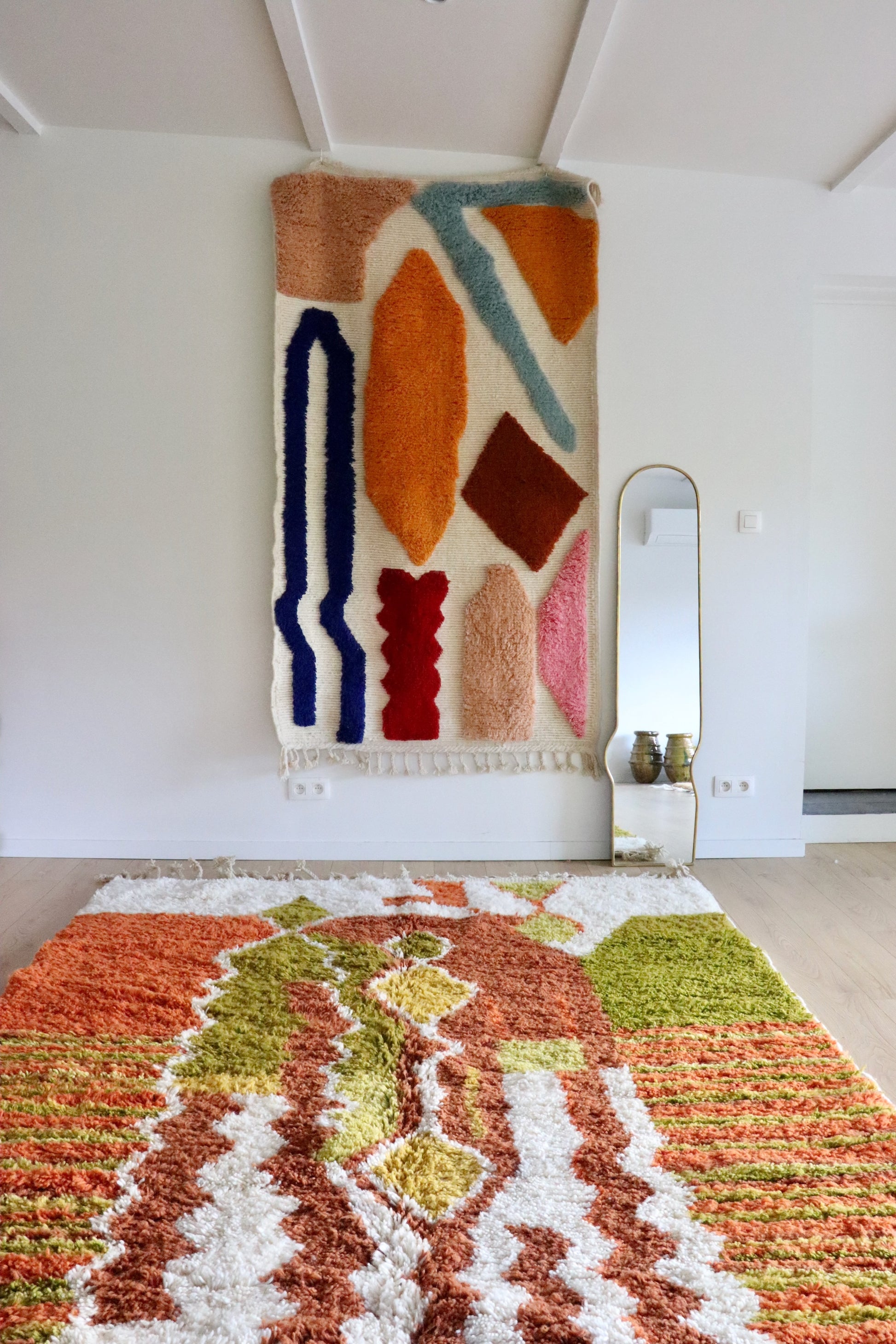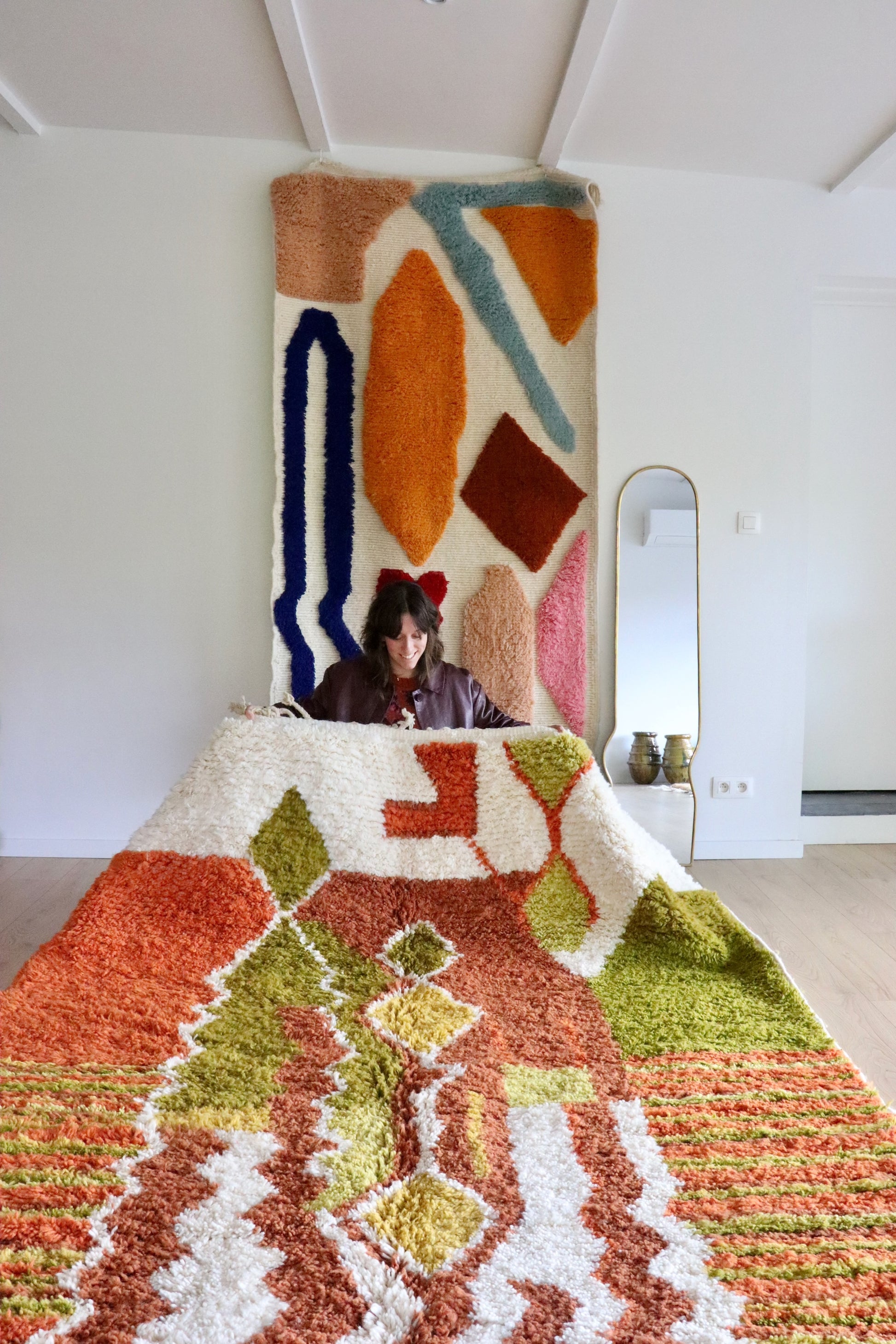 Tissé à la main à Khemisset, ce tapis Beni Ouarain d'un genre nouveau est une pièce unique 100% laine.