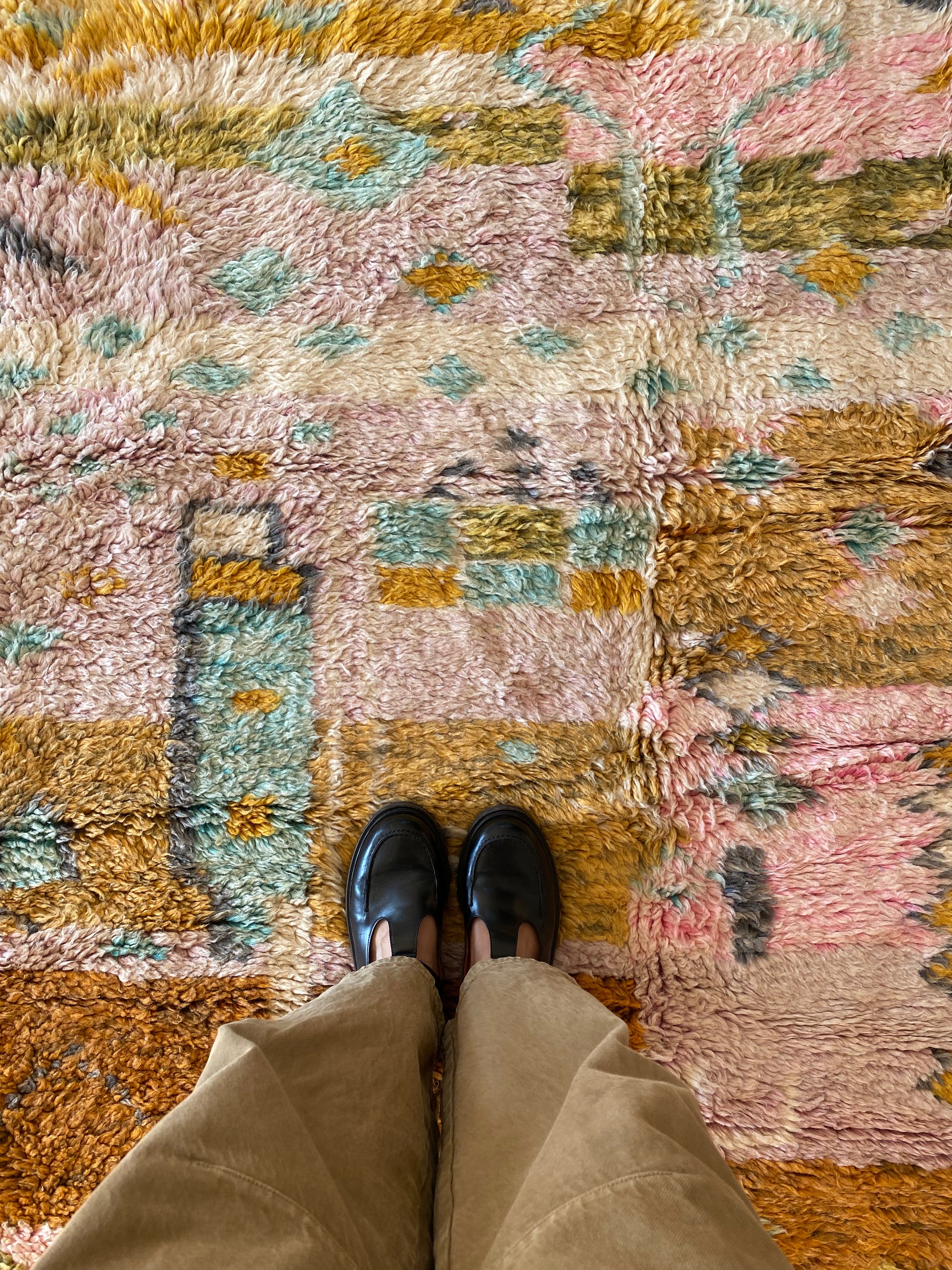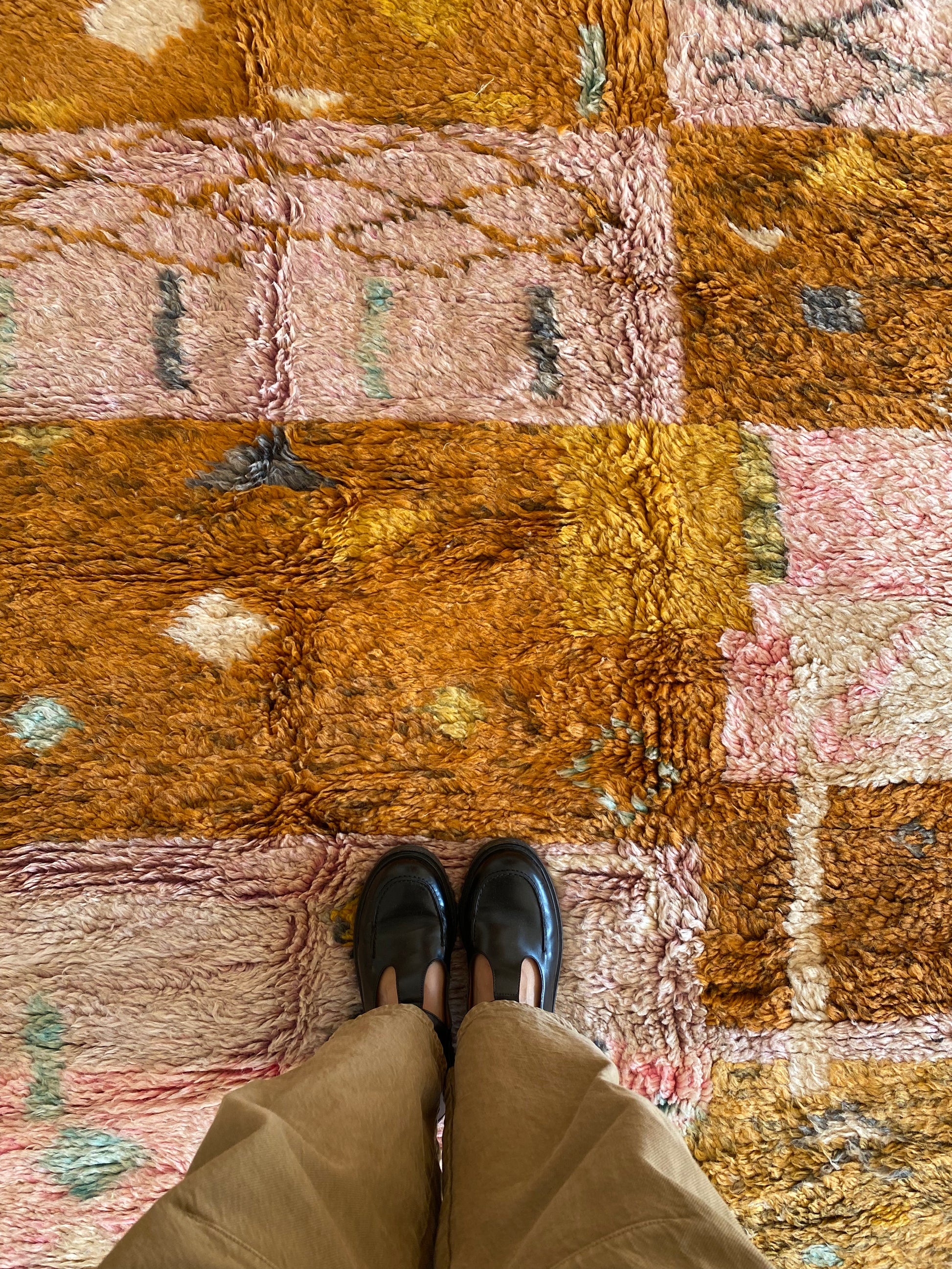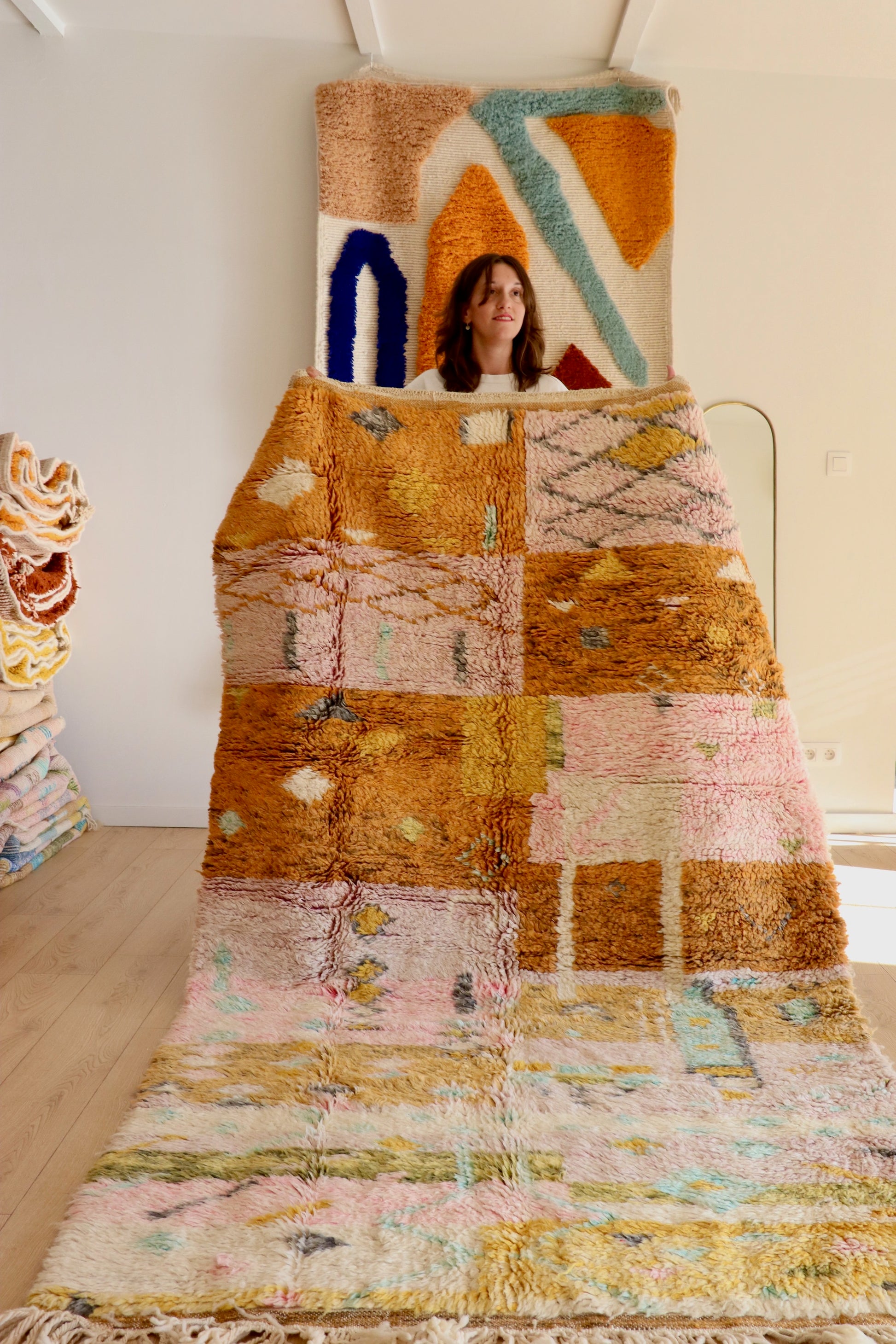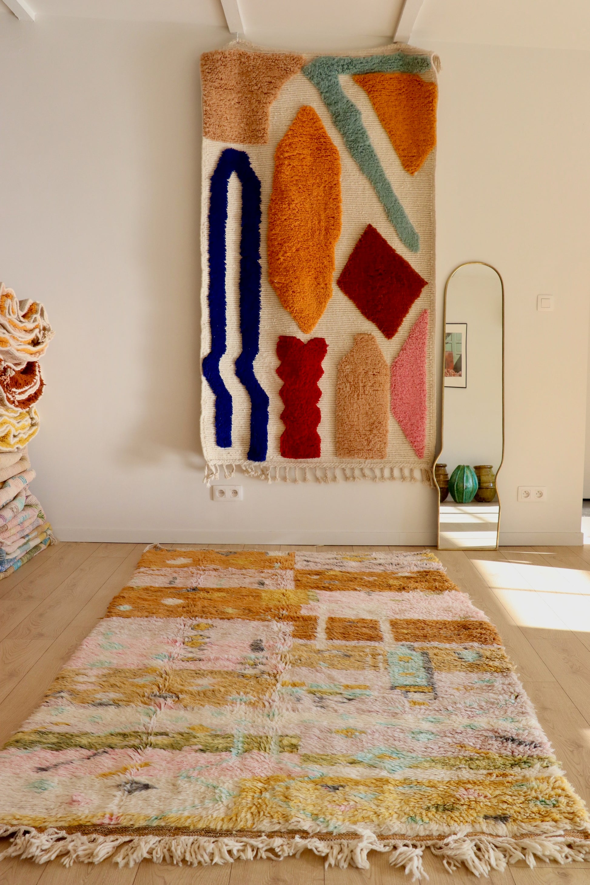 Tissé à la main à Khemisset, ce tapis Beni Ouarain d'un genre nouveau est une pièce unique 100% laine.