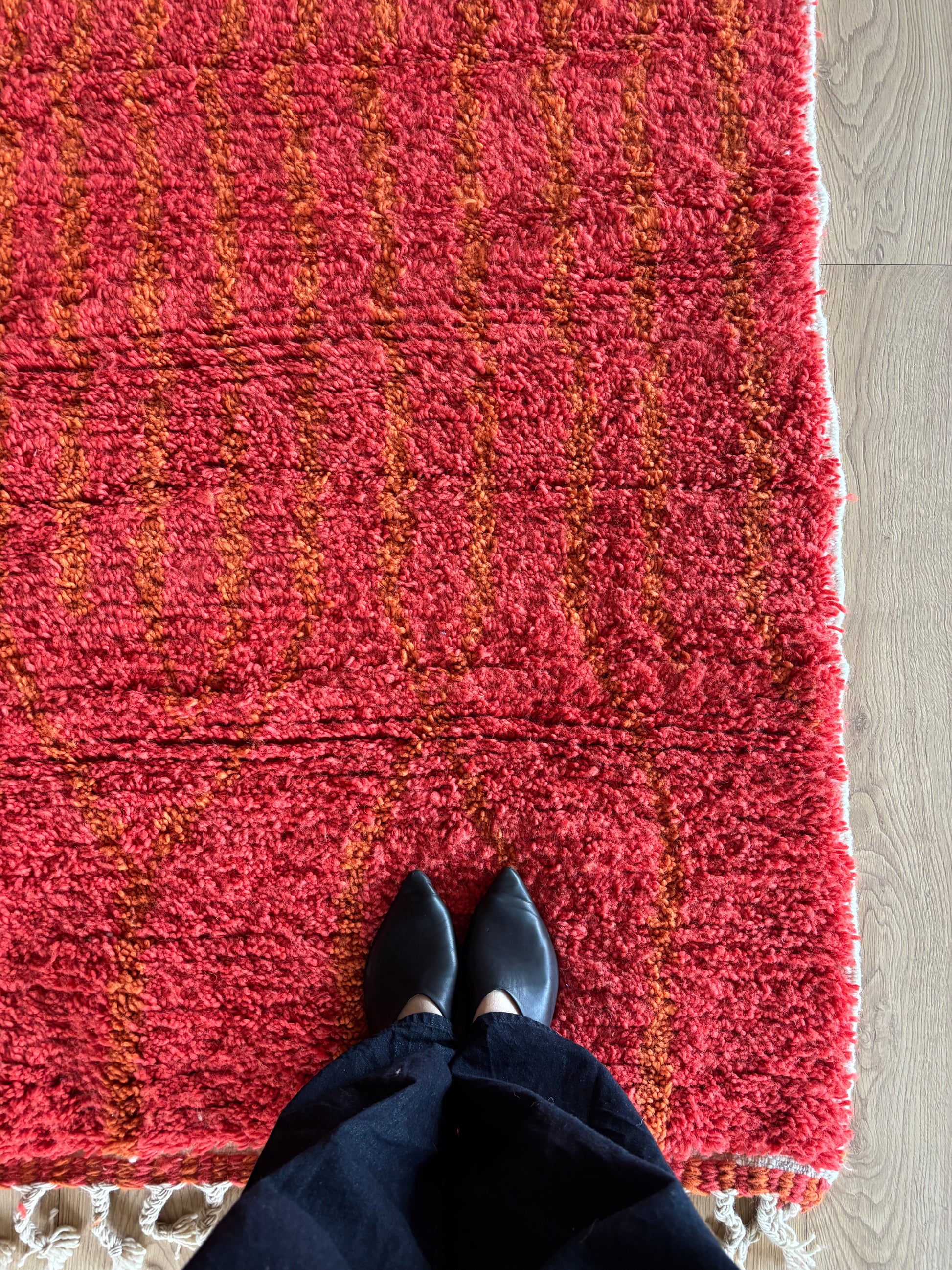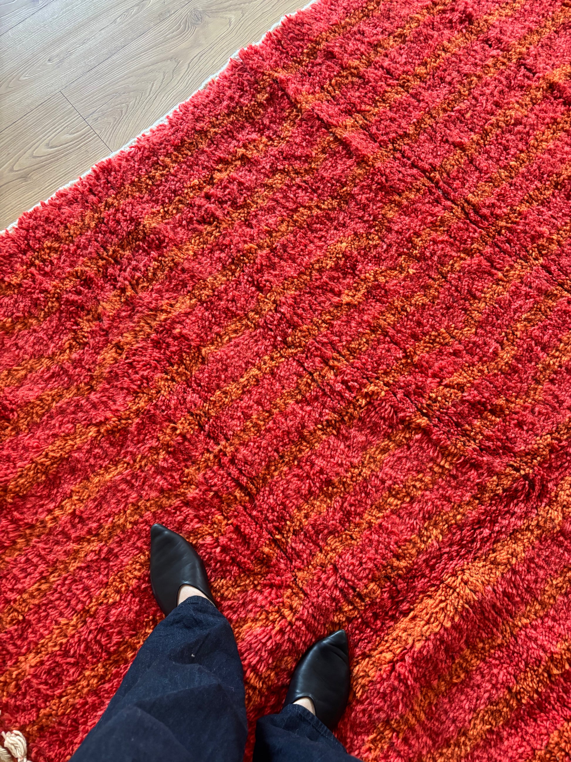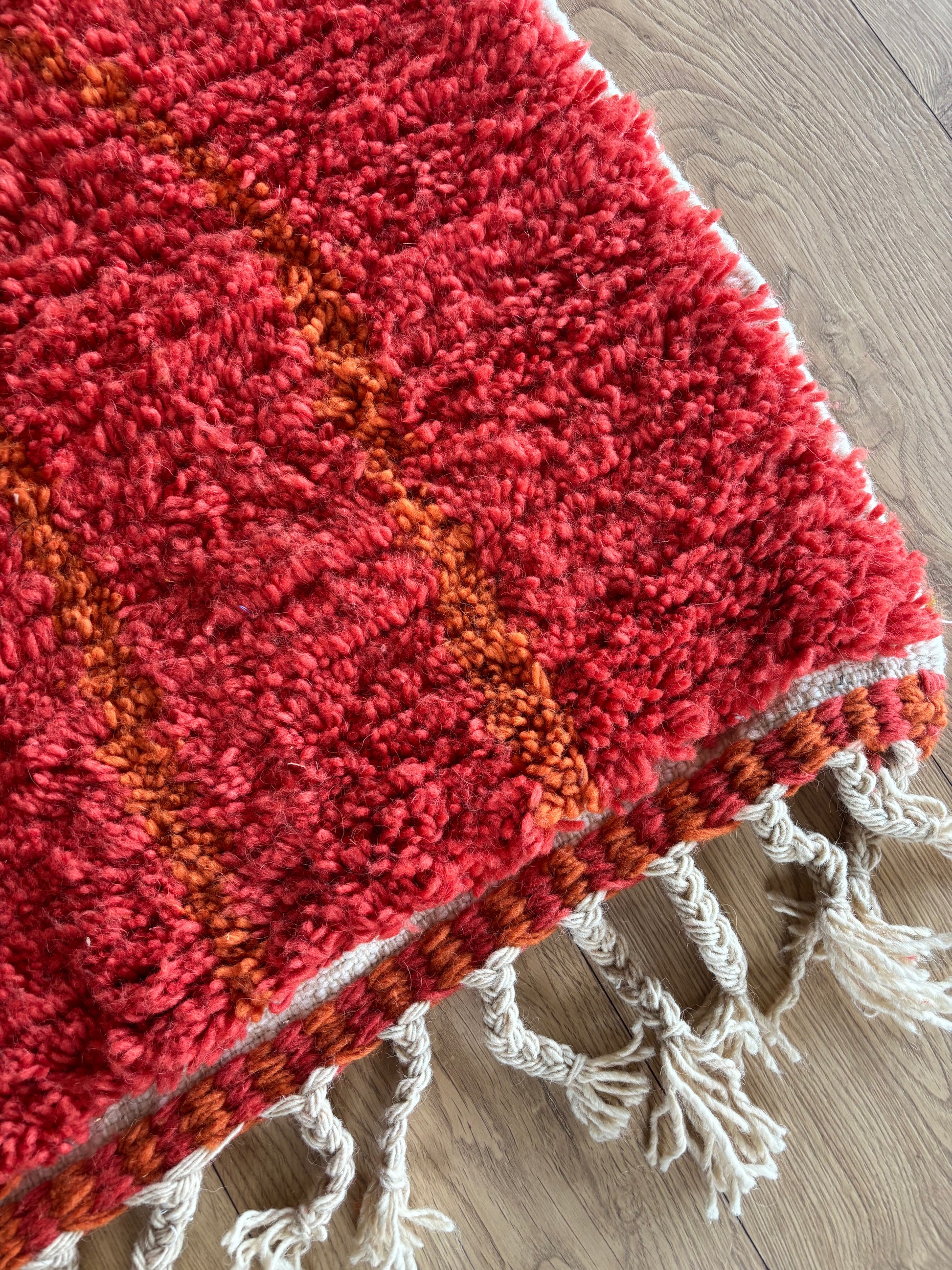 Dit tapijt is handgeweven van natuurlijke schapenwol door Berberse ambachtslieden in Khemisset, Marokko. Elk tapijt is uniek en met zorg vervaardigd om lang mee te gaan.