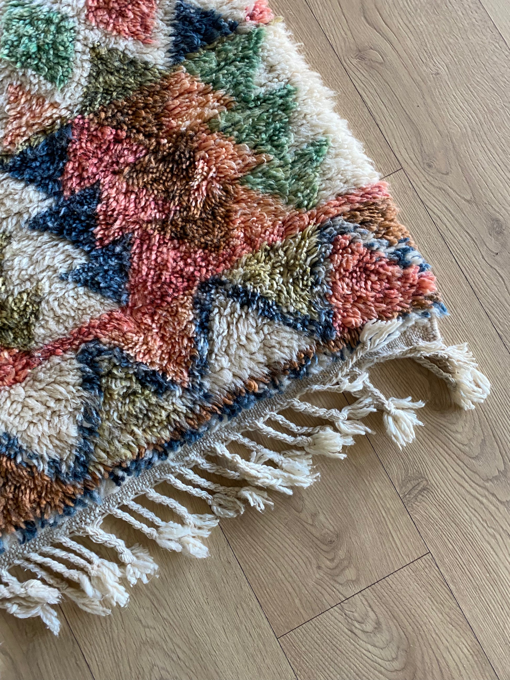 Handgemaakt door Berberwevers in Khemisset, Marokko, is dit tapijt een echt uniek stuk, gemaakt van wol. Met zijn kleurrijke patronen zal dit tapijt een heldere en authentieke look aan uw interieur geven.