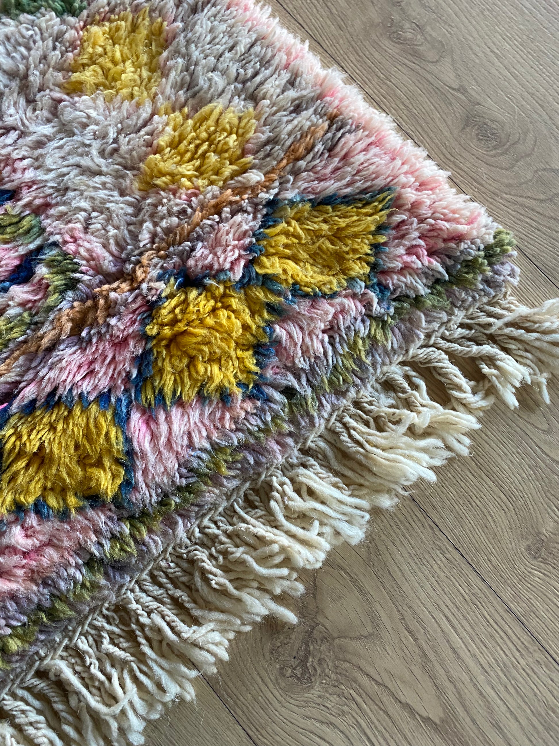 Handgemaakt door Berberwevers in Khemisset, Marokko, is dit tapijt een echt uniek stuk, gemaakt van wol. Met zijn kleurrijke patronen zal dit tapijt een heldere en authentieke look aan uw interieur geven.