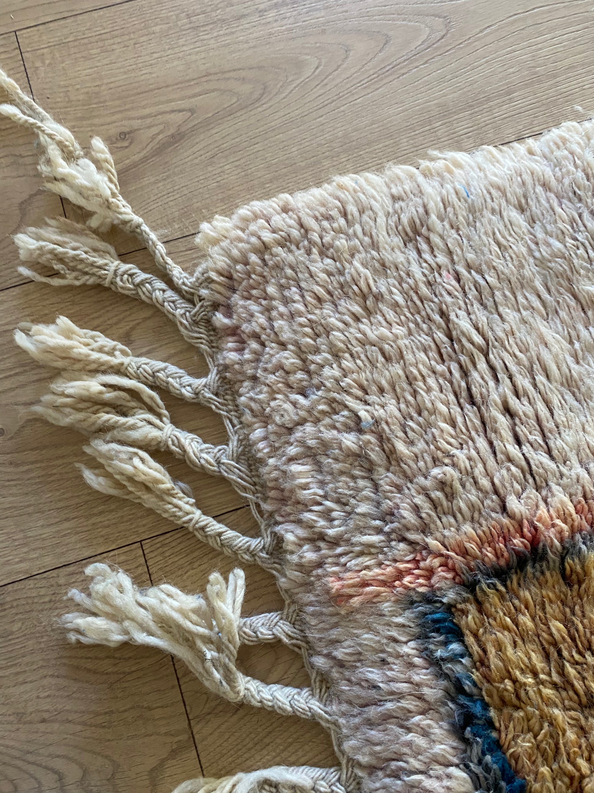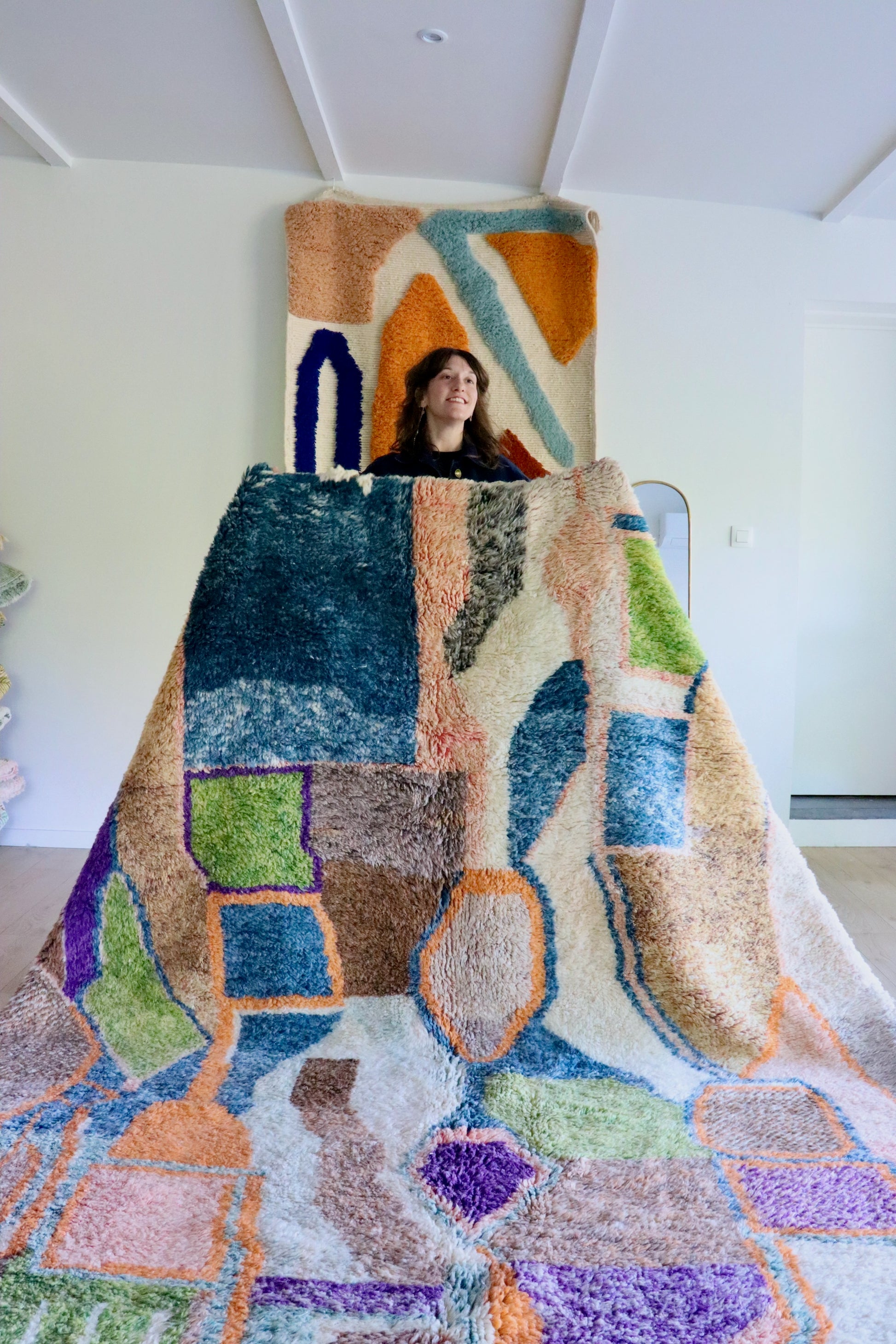 Handgemaakt door Berberwevers in Khemisset, Marokko, is dit tapijt een echt uniek stuk, gemaakt van wol. Met zijn kleurrijke patronen zal dit tapijt een heldere en authentieke look aan uw interieur geven.