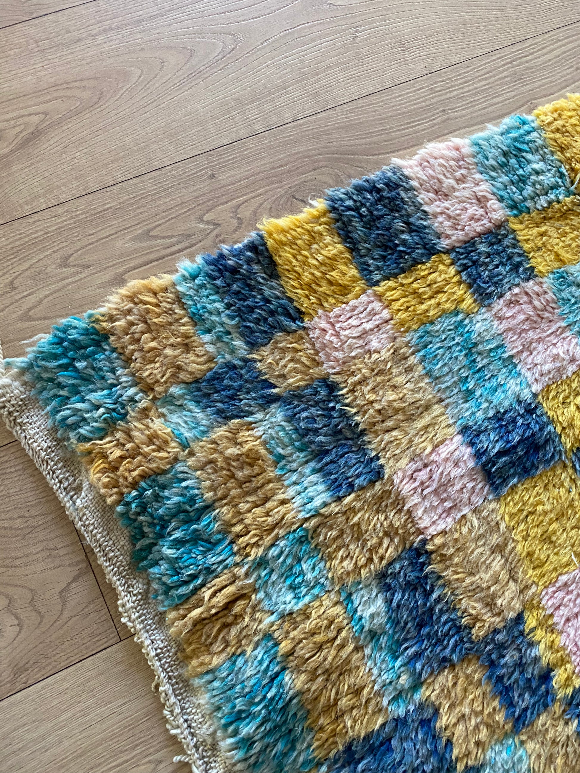 Handgemaakt door Berberwevers in Khemisset, Marokko, is dit tapijt een echt uniek stuk, gemaakt van wol. Met zijn kleurrijke patronen zal dit tapijt een heldere en authentieke look aan uw interieur geven.