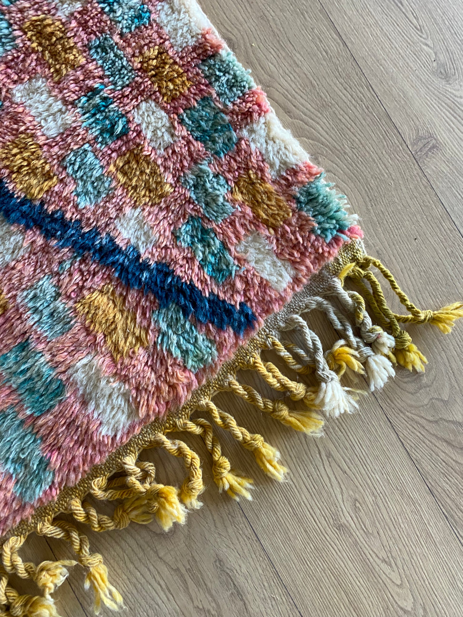 Handgemaakt door Berberwevers in Khemisset, Marokko, is dit tapijt een echt uniek stuk, gemaakt van wol. Met zijn kleurrijke patronen zal dit tapijt een heldere en authentieke look aan uw interieur geven.