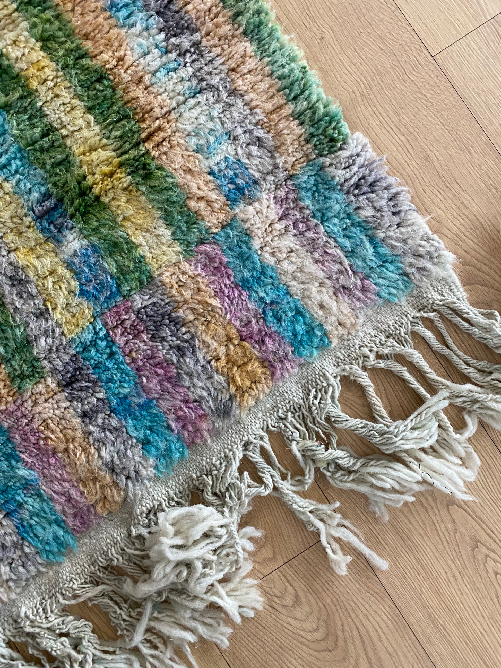 Handwoven from natural wool in Khemisset, this Beni Ouarain rug is a unique piece that will bring color and vibrancy to your home.
