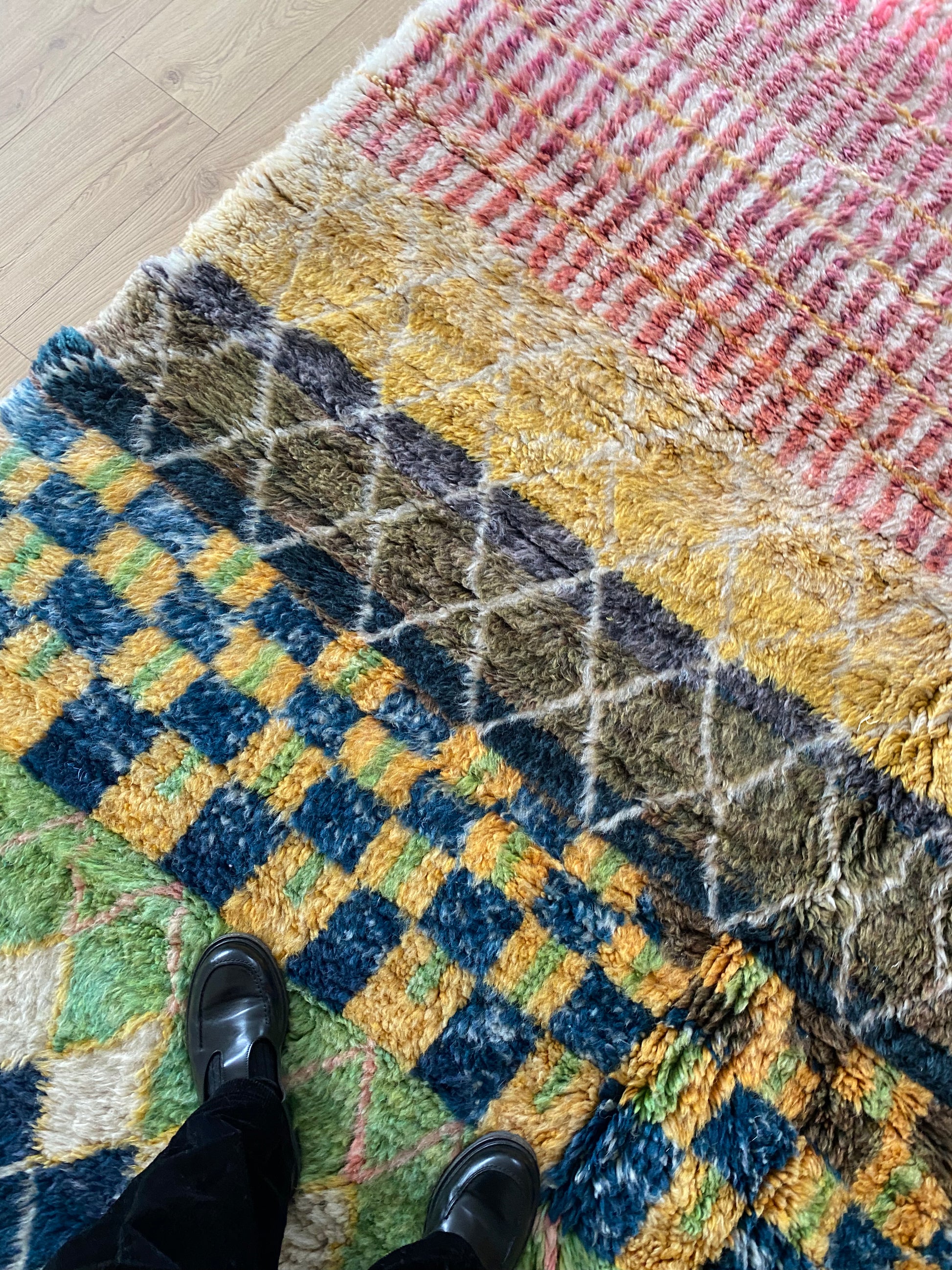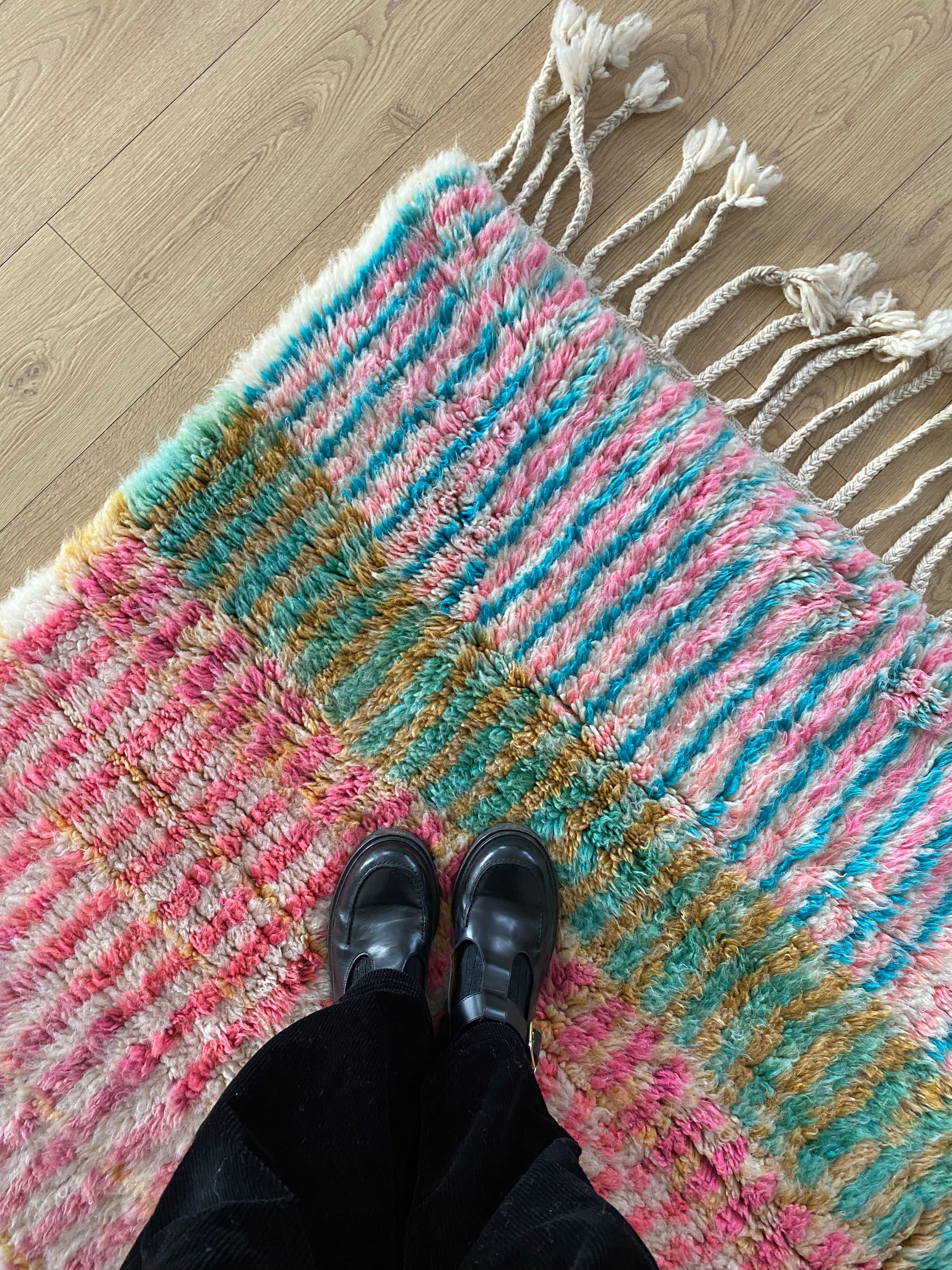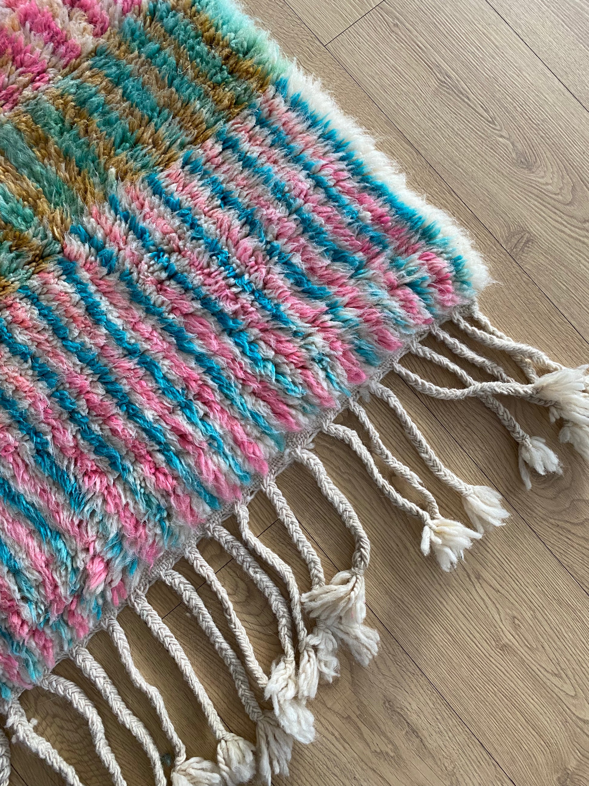 Handwoven from natural wool in Khemisset, this Beni Ouarain rug is a unique piece that will bring color and vibrancy to your home.