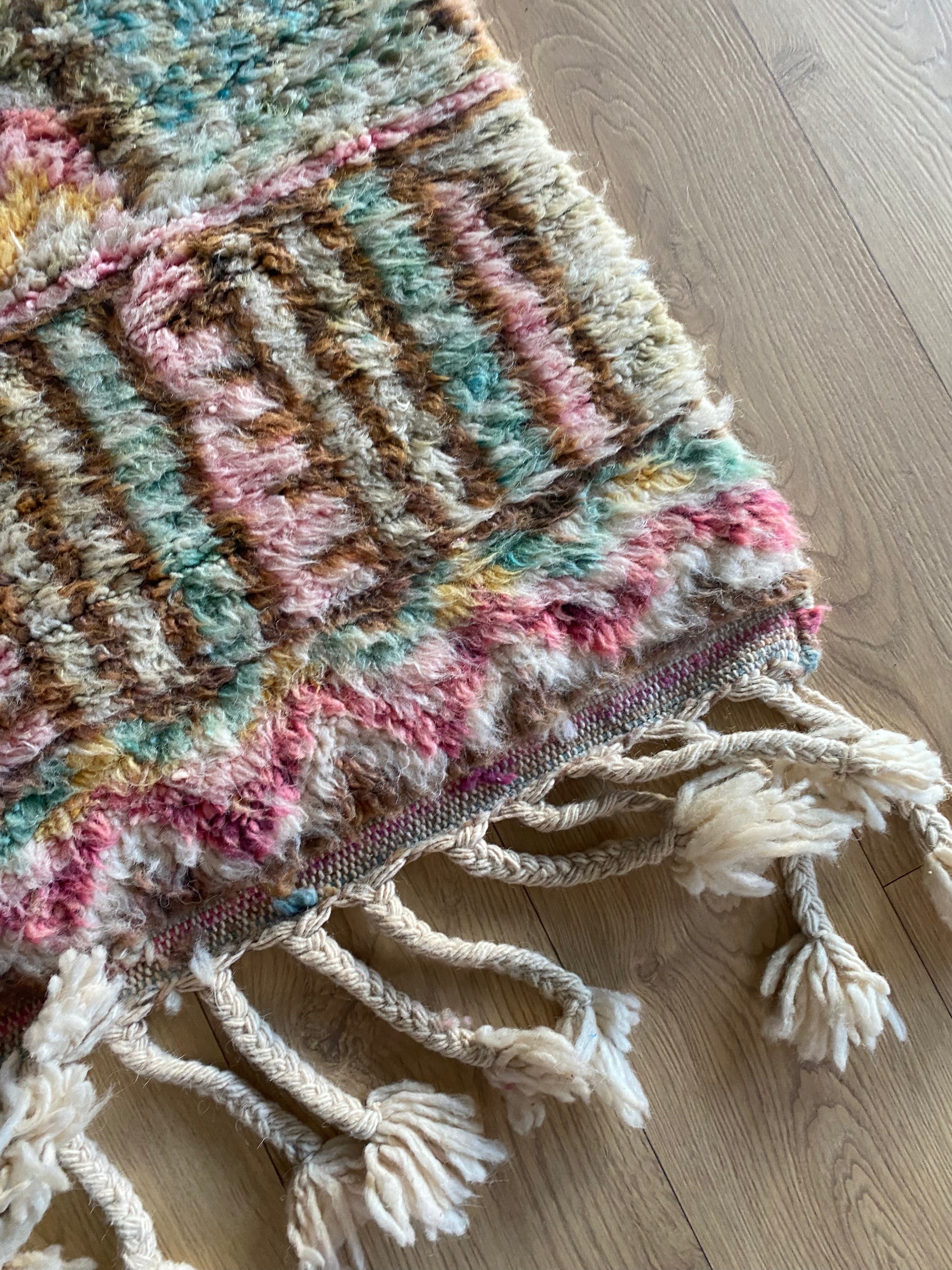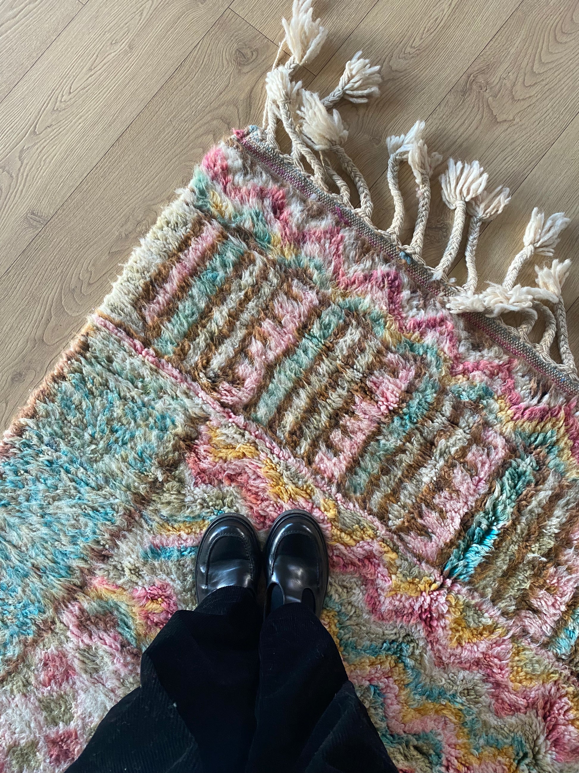 Handwoven from natural wool in Khemisset, this Beni Ouarain rug is a unique piece that will bring color and vibrancy to your home.