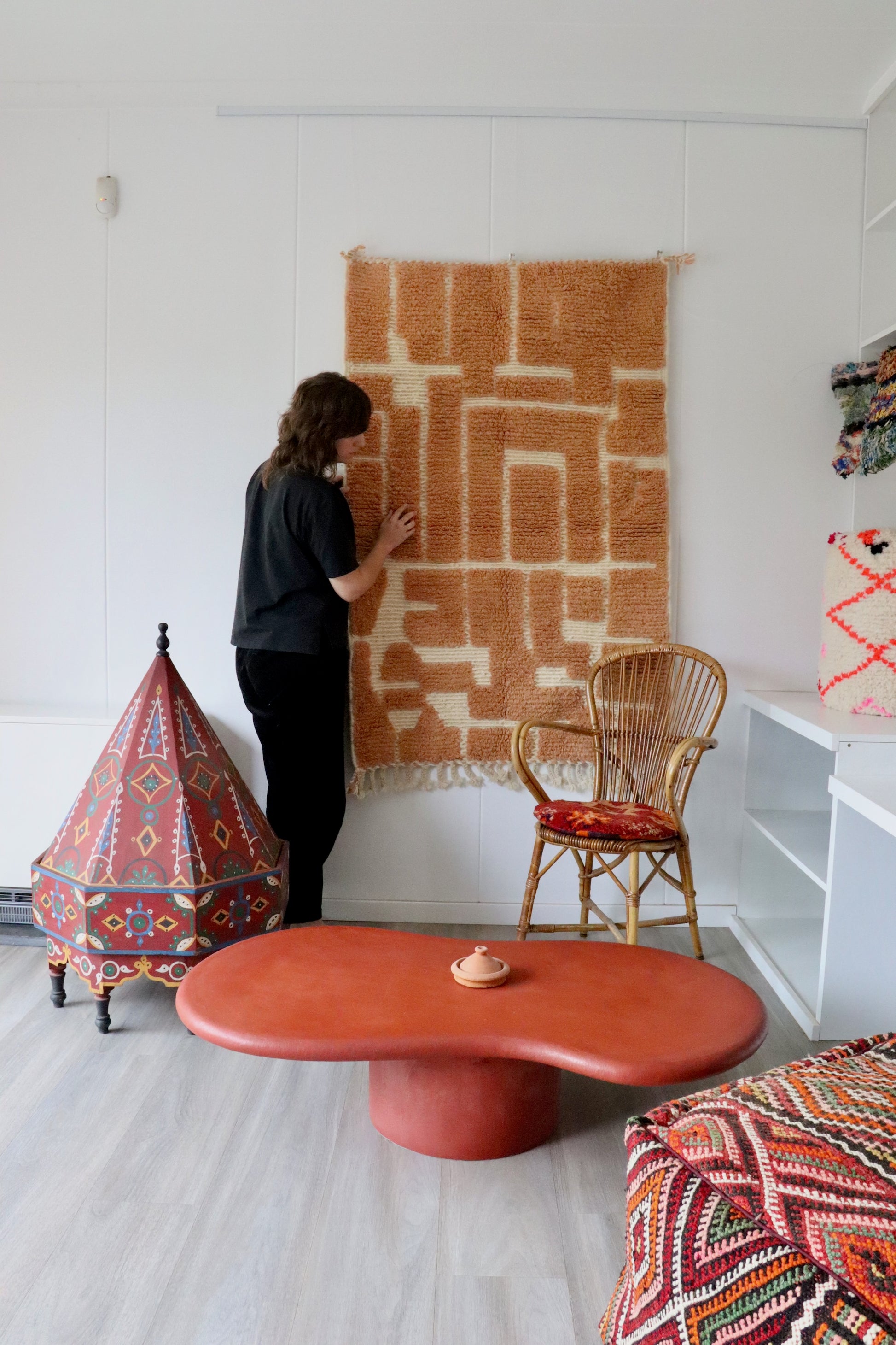 Handmade by Berber weavers in Khemisset, Morocco, this small rug was designed to be displayed as wall art. Each piece, made with natural wool, tells its own story through colors and textures, bringing character and soul to your space.